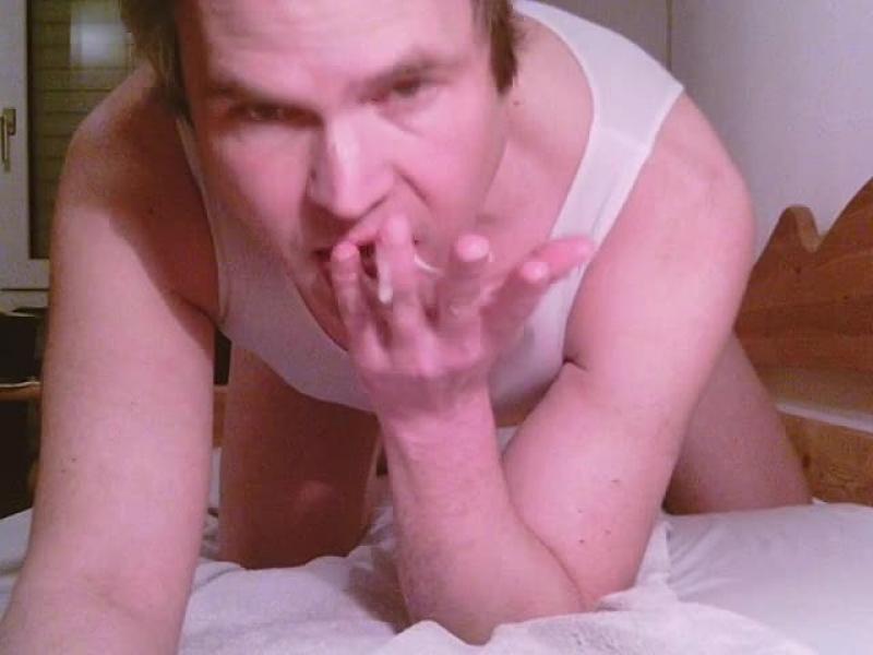 Zuerst spiele ich an meinem Schwanz, der im weissen Damenstring verpackt ist. Dann packe ich ihn aus und wichse ihn geil. Direkt vor der Kamera spritze ich eine Megaladung auf die Hände und lecke meine frische Wichssahne ab, genieße und schlucke sie geil….