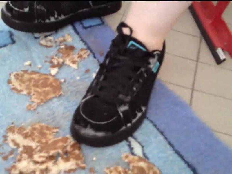 Mit den alten Schuhen werden von Ihr leckere Schokoriegel auf der alten Badematte zertreten..hast Du Hunger.