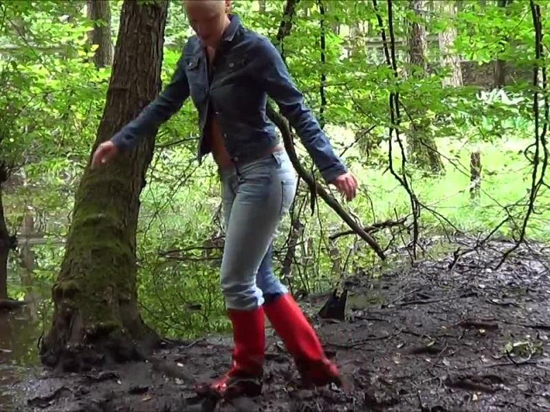 Im engen Jeansoutfit (Jacke von Buffalo und Hose von Only) mit roten Absatzgummistiefeln (Ju Ju) habe ich mir im tiefen Sumpf einfach in die Jeans gepisst weil ich dringend musste und ich nicht so schnell da raus kam. Damit man die Pisspuren in der Jeans nicht so sieht, habe ich mich komplett mit Schlamm eingesaut bis die Hose nicht mehr hellblau sondern braun war. Hab mich richtig mit dem Arsch in den Sumpf gesetzt. Die Jacke und meine Titten war fast genauso verschlammt als ich fertig mit einreiben war 🙂 Der Schlamm lief mir in die glänzenden roten Stiefel als ich durch den Schlamm gewatet bin und wieder andauernd stecken blieb.