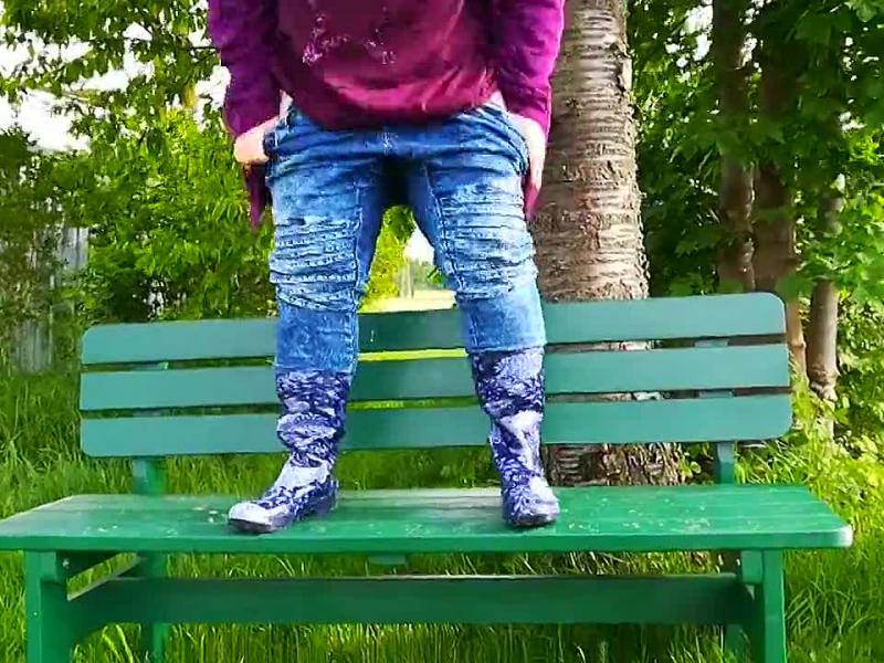 Es hat gerade aufgehört zu regnen und ich nutze diese Chance natürlich gleich mal. Mit besonders schön glänzenden Gummistiefeln mache ich mich auf den Weg ins Grüne um dort die perfekte Pissgelegenheit vorzufinden: Eine grüne Bank! Super um in einem richtig weiten Strahl loszupissen! Stell dir nur mal vor, du liegst auf dem Boden, im grünen Gras und ich versuche dir in den Mund zu pissen. Wäre das nicht ein Spaß 😉